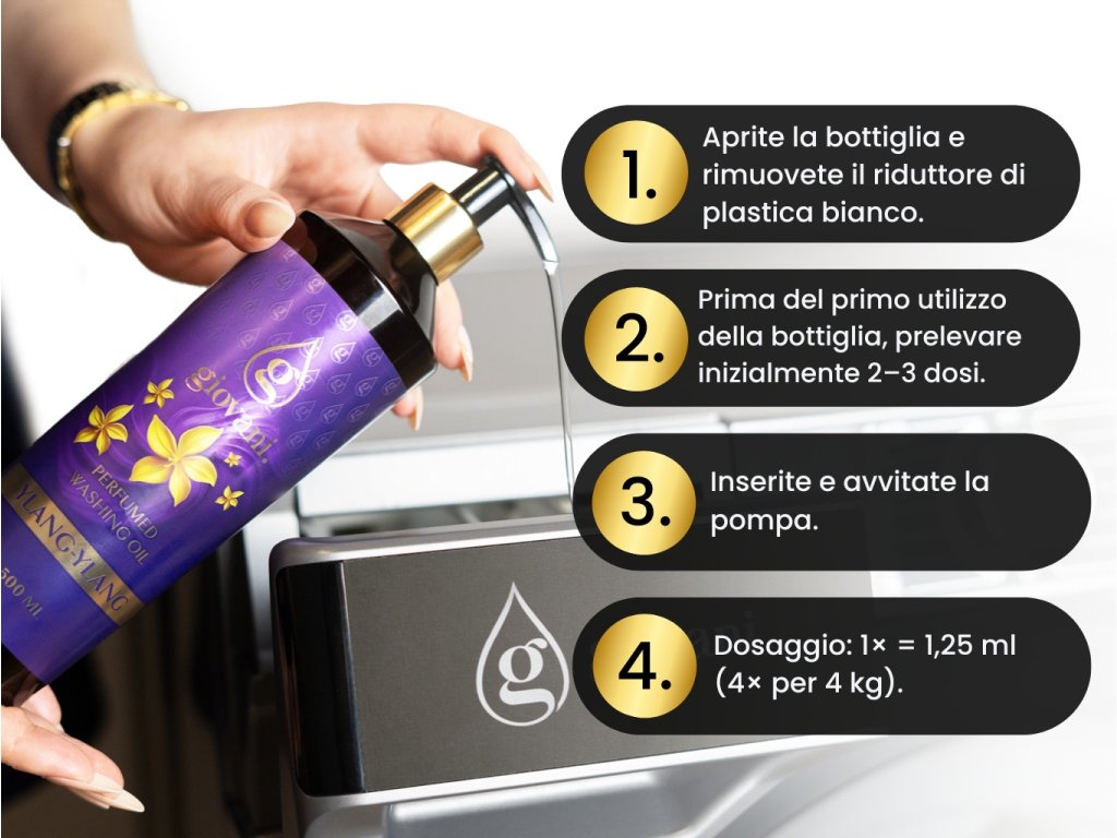 La pompa è adatta a tutti i formati di flaconi di profuma bucato Giovani®.