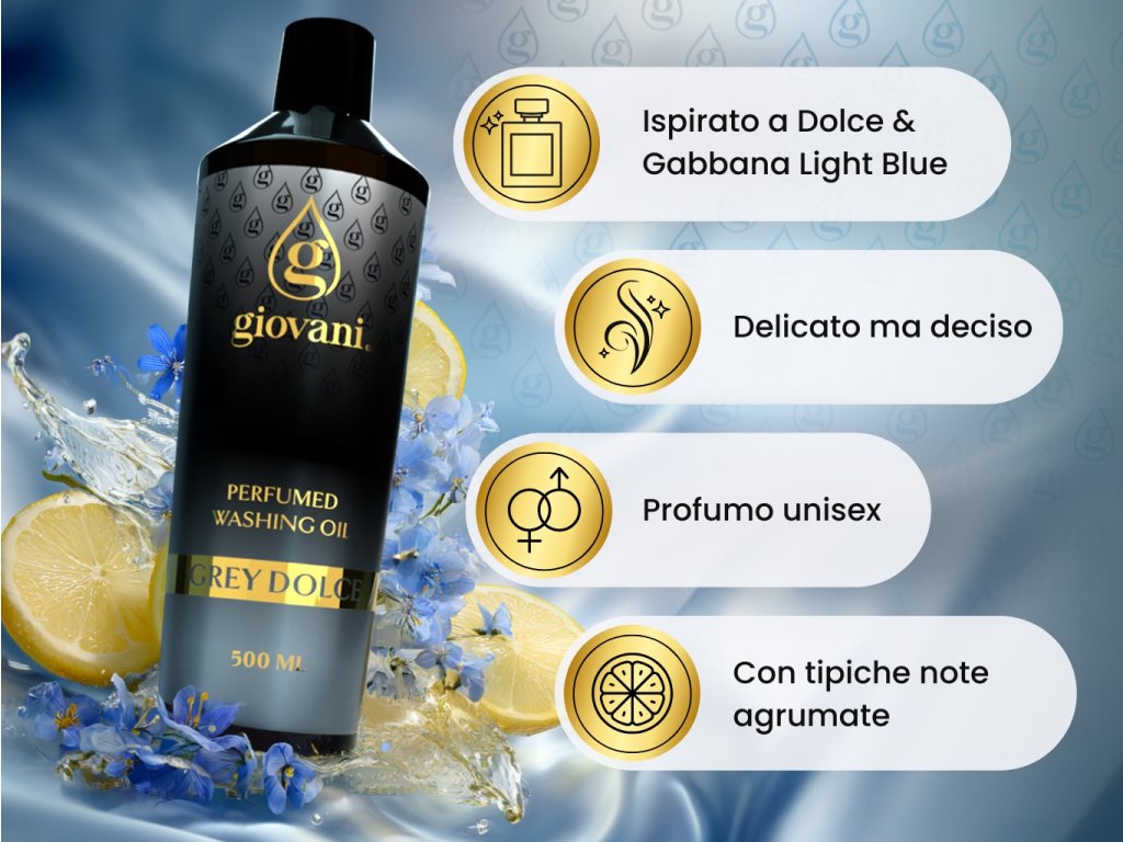 Il profumo intenso e duraturo del bucato sarà trasportato da note di mela verde, cedro di Sicilia, rosa bianca, legno di cedro e fiori blu dopo aver usato il profumo per bucato Grey Dolce di Giovani®. Le sfumature legnose sono create principalmente da bambù e legno di cedro. Gelsomino, ambra e muschio completano l'esperienza olfattiva.