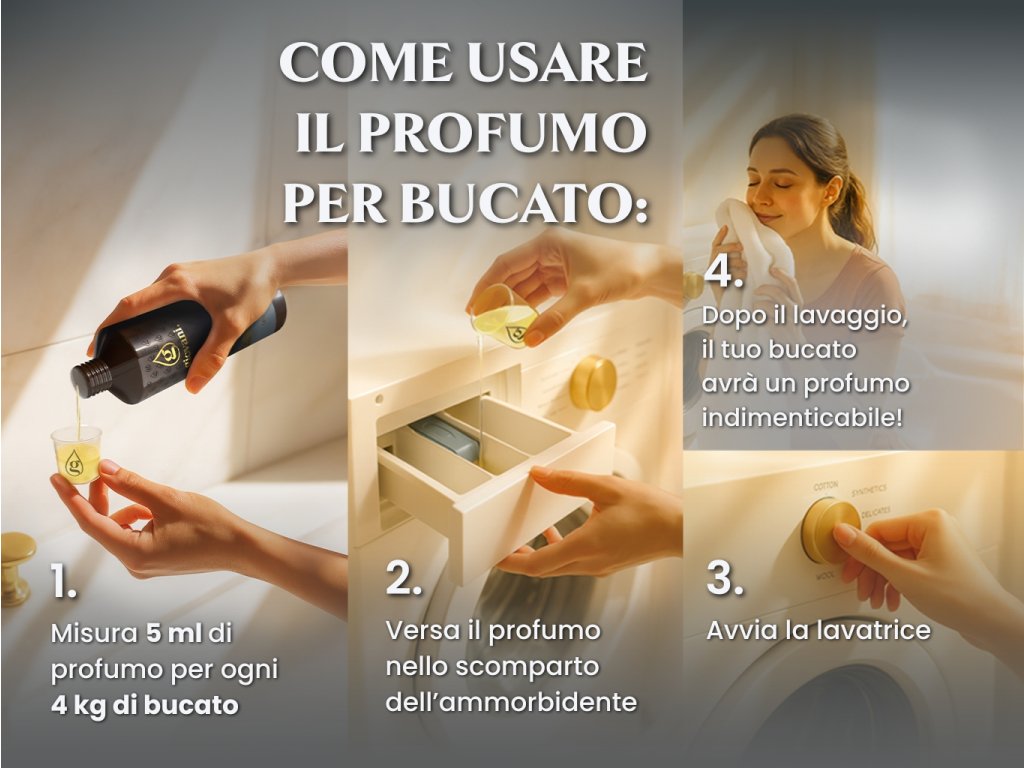 Utilizzo: Versare 5 ml di concentrato nel contenitore dell'ammorbidente. Questa quantità corrisponde a una dose per 4 kg di biancheria. Il concentrato non è diluito. Puoi utilizzare il tappo del profumo Giovani® (equivalente a 3 ml) e applicare 2 dosi per ottenere l'intensità perfetta. Per un dosaggio ancora più comodo, puoi acquistare il nostro misurino con logo o una pompa dosatrice. Basta quindi una piccola quantità e il vostro bucato sarà perfettamente profumato!