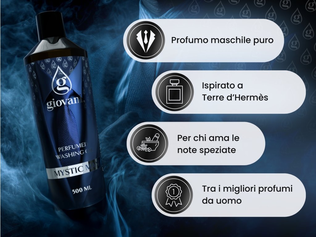 Mystic Man è un profumo per il bucato a base di olio, che trasforma ogni capo in un’esperienza di forza e serenità.