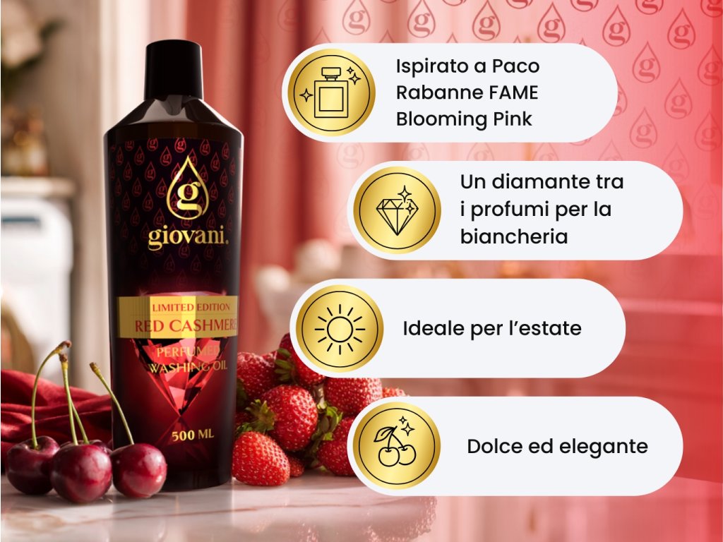 Conoscerete sicuramente il famoso profumo con la confezione a forma di robot vestito con una camicetta da donna che è diventato un po' un oggetto da collezione. Il nostro profumo per bucato Giovani RED CASHMERE si ispira a questa iconica fragranza di Paco Rabanne FAME, leggermente esaltata, soprattutto con toni di zucchero filato.