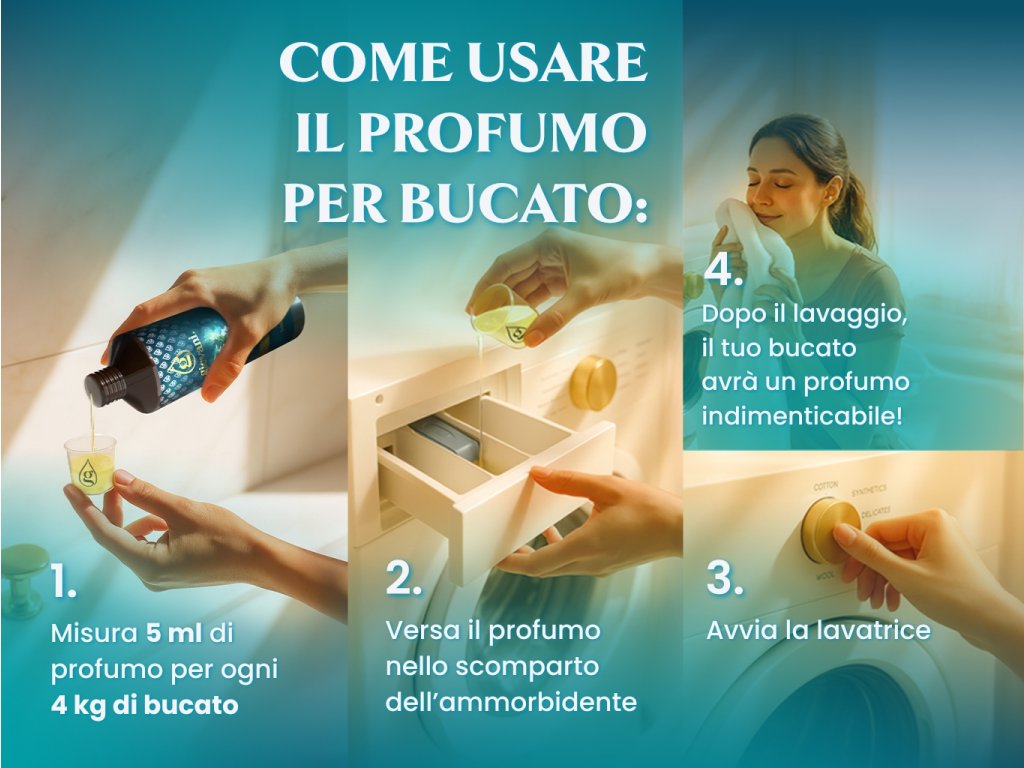 Utilizzo: Versare 5 ml di concentrato nel contenitore dell'ammorbidente. Questa quantità corrisponde a una dose per 4 kg di biancheria. Il concentrato non è diluito. Puoi utilizzare il tappo del profumo Giovani® (equivalente a 3 ml) e applicare 2 dosi per ottenere l'intensità perfetta. Per un dosaggio ancora più comodo, puoi acquistare il nostro misurino con logo o una pompa dosatrice. Basta quindi una piccola quantità e il vostro bucato sarà perfettamente profumato!