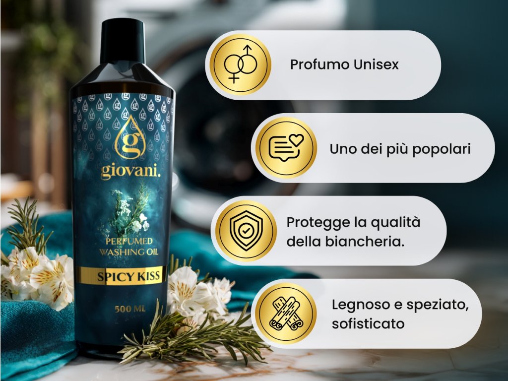 Il profumo per bucato Spicy Kiss, con le sue sfumature speziate, dona una freschezza perfetta ai tuoi capi.