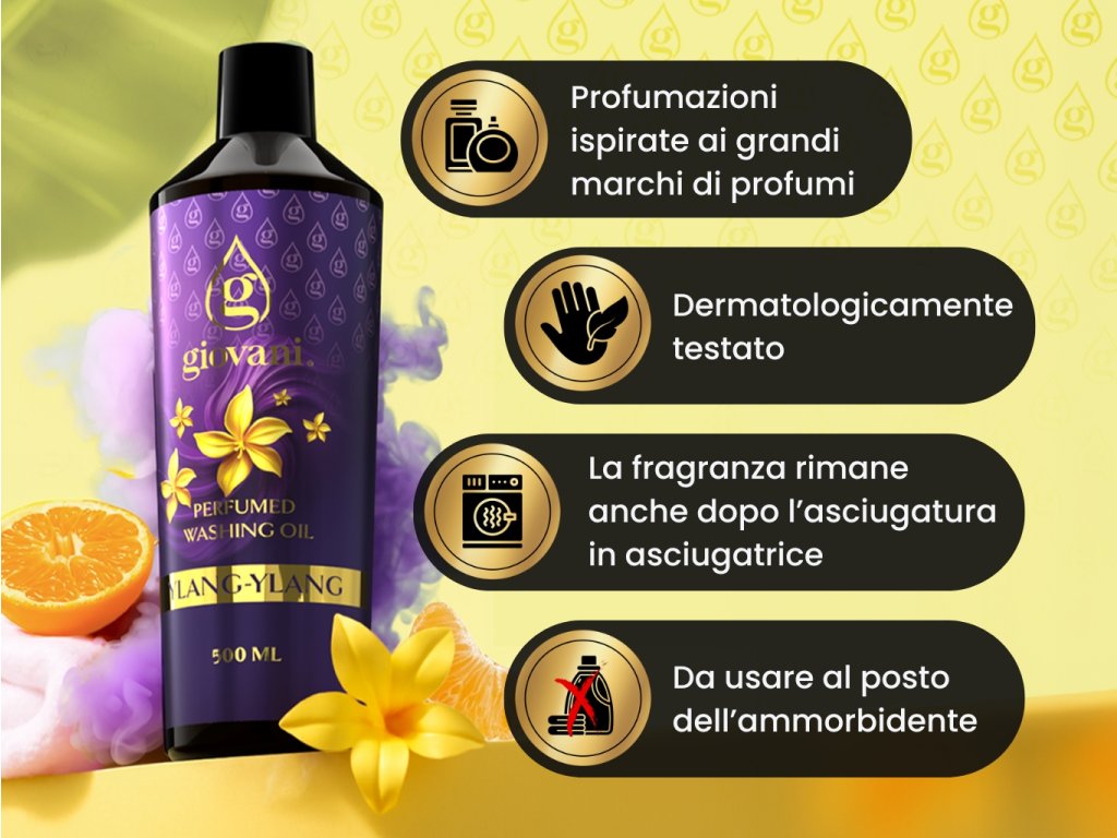 Giovani® è un marchio esclusivo e di lusso di profumi per il bucato. Abbiamo prestato molta attenzione a garantirne l'alta qualità. Nello sviluppo di queste fragranze, per noi era importante ottenere una forte intensità e una lunga durata, in modo da poter parlare di Giovani® come del marchio di profumi per bucato di migliore qualità sul mercato. Il loro grande vantaggio è che non intasano la lavatrice, non lasciano residui grassi e non macchiano i capi. Grazie al contenuto di alcune sostanze, i nostri oli si prendono cura anche del colore del bucato. Sono vegani, privi di diossano, SVHC, parabeni, sostanze PBT/vPvB, metalli pesanti, residui inquinanti, microplastiche o nanoplastiche. |
