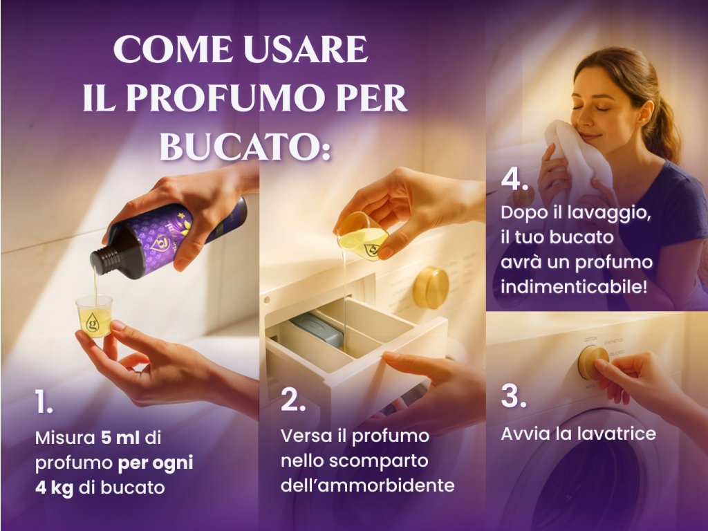 Non mettere il profumo nel cestello della lavatrice o nell'asciugatrice. Sono destinati direttamente all'uso nel contenitore dell'ammorbidente. Non dovete preoccuparvi che il vostro bucato perda il suo profumo dopo l'asciugatura in asciugatrice. I profumi Giovani® sono resistenti agli agenti esterni e duraturi. Il bucato lavato sarà profumato anche dopo l'uso dell'asciugatrice. La temperatura ottimale per la conservazione degli oli per bucato è di circa 15-25 gradi Celsius.