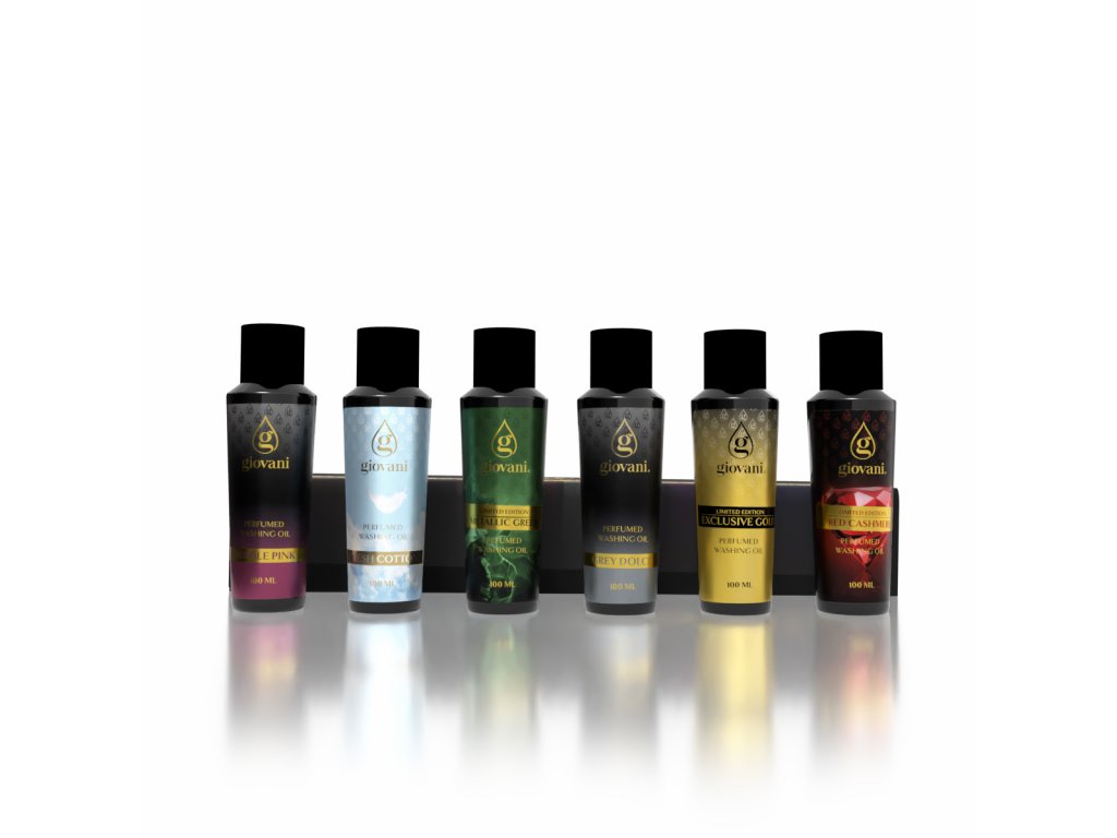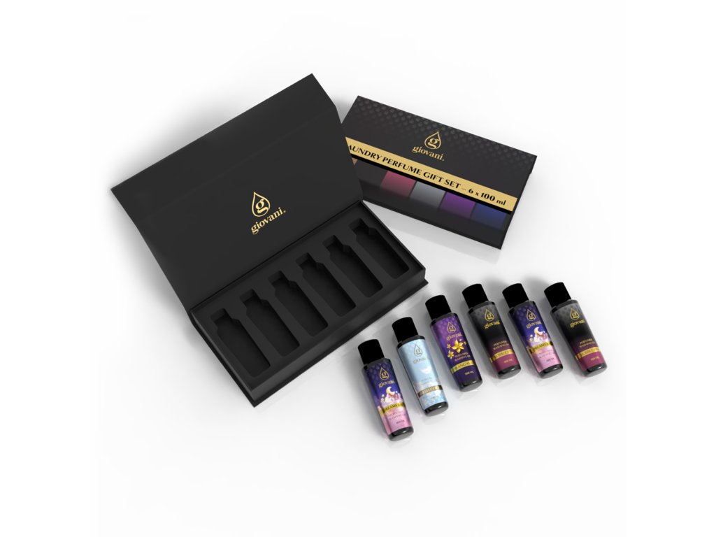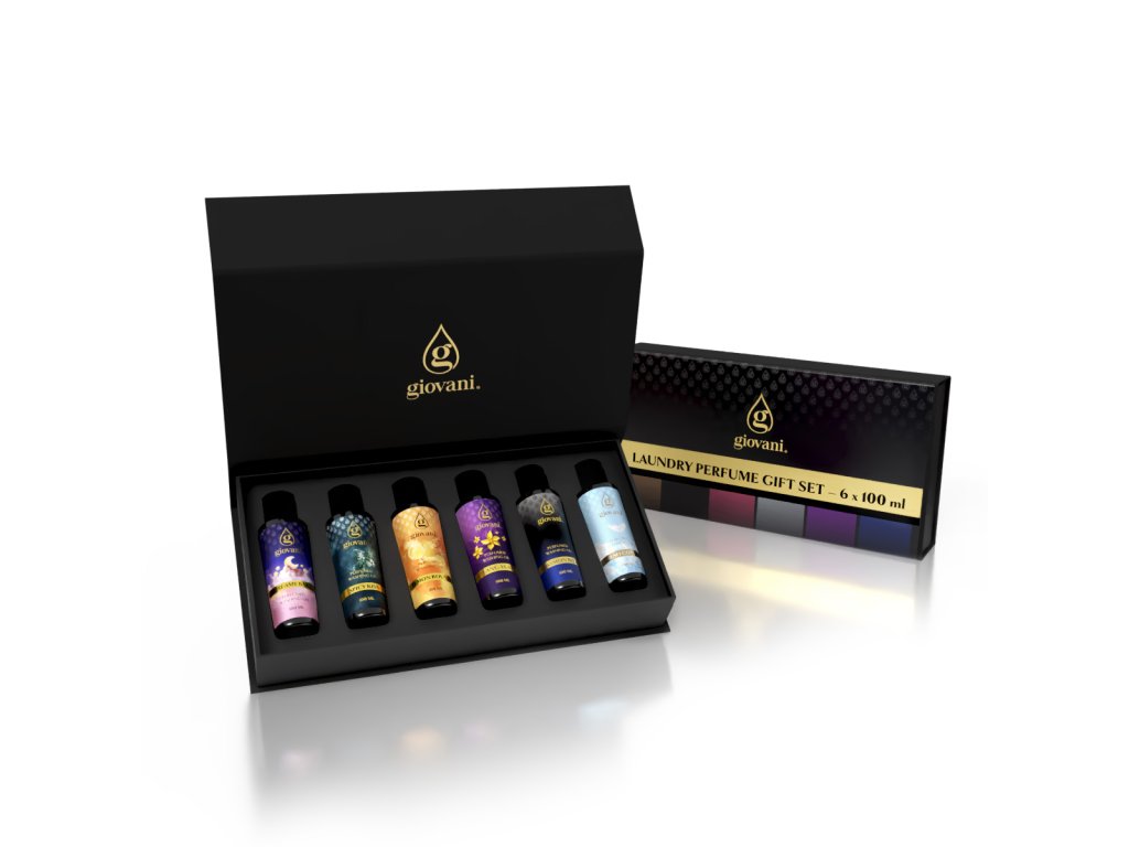 La confezione contiene sei profumi da bucato Giovani® da 100 ml.