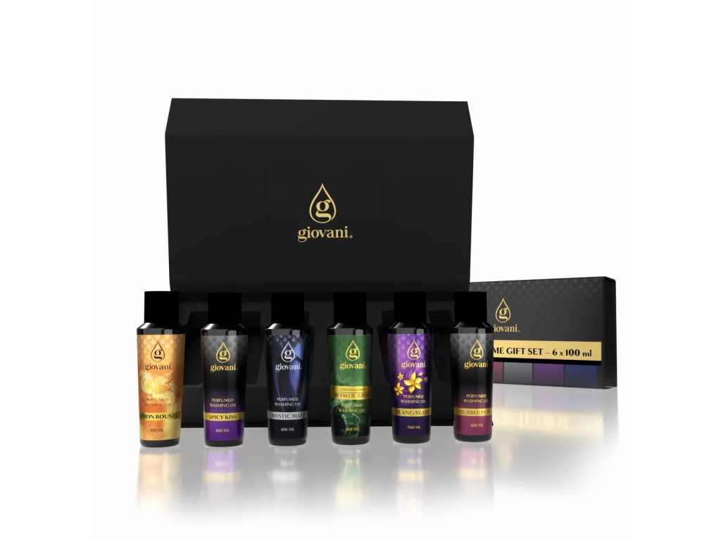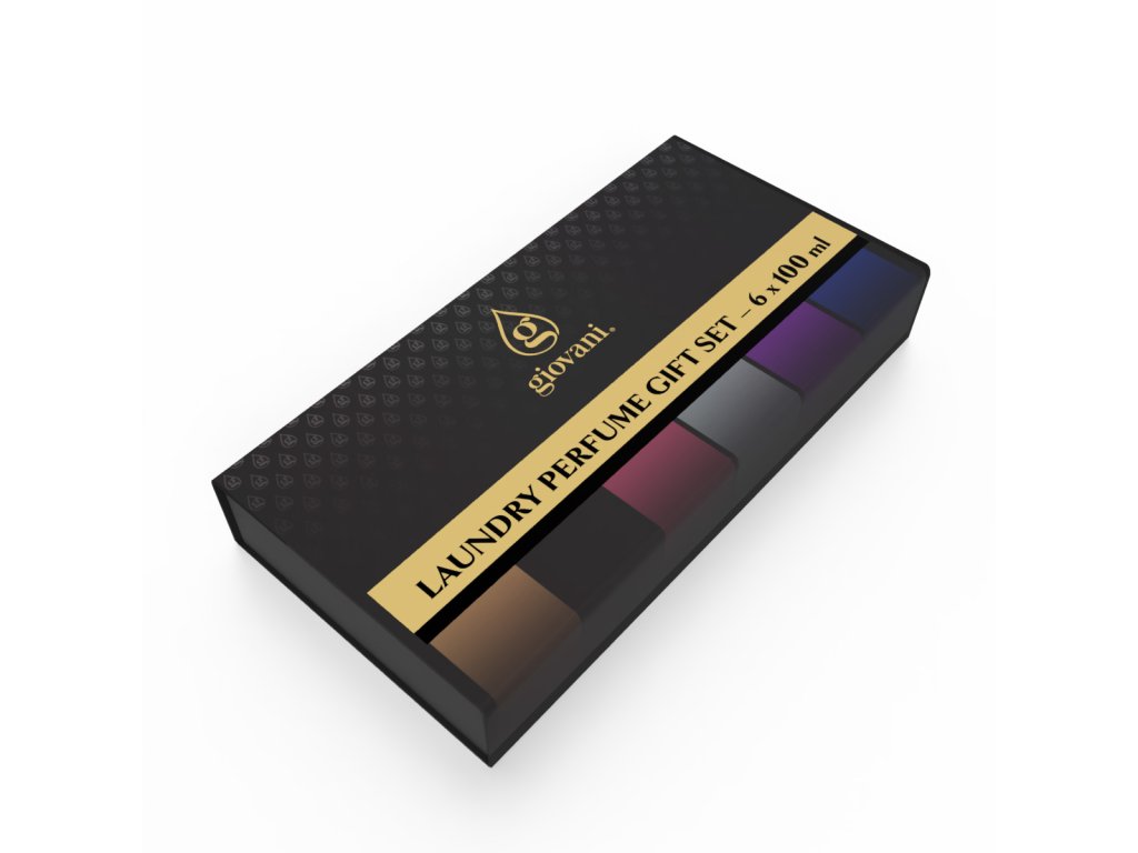 Regalate ai vostri cari i profumi da bucato più profumati del mercato, confezionati in una splendida scatola regalo. Un regalo così lussuoso farà la gioia di tutti e colpirà al primo sguardo. Una volta aperta la scatola, arriva un altro momento di sorpresa e delizia. Come suggerisce già la superficie esterna della scatola, all’interno troverete 6 fragranze premium Giovani®, riposte in modo sicuro nei loro alloggiamenti, sormontate dal logo Giovani® 3D in oro metallizzato. La scatola è dotata di una pratica chiusura magnetica. Sullo sfondo della sua superficie di velluto opaco si trovano anche gli ologrammi del nostro logo.